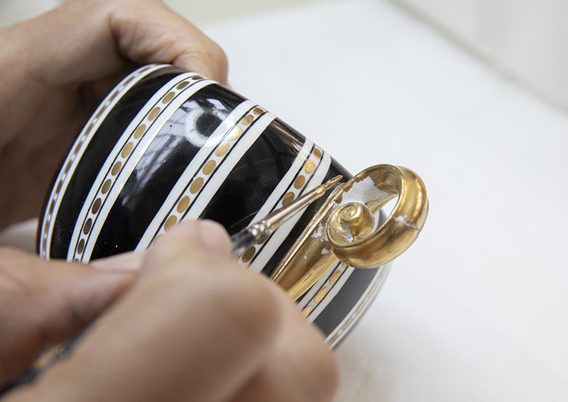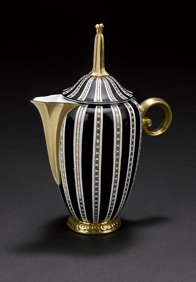“The ‘Campanula’ design is distinguished by a scrolling handle and an elaborate long fluted finial surmounted by a fleur-de-lis. The hand-painted decoration features black enamel stripes highlighted with a gilded stripe motif, on a gilded base with a scroll pattern.”