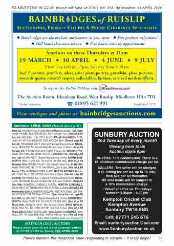 TO ADVERTISE IN CC101 please call Kara on 07311 631 313. Ad deadline: 24 APRIL 2020BAINBR DGESof RUISLIP AUCTIONEERS, PROBATE VALUERS & HOUSE CLEARANCE SPECIALISTS Bainbridges are the probate auctioneers in your area Free probate valuations Full house clearance service Free house visits by appointmentAuctions on these Thursdays at 11am19 MARCH 30 APRIL 4 JUNE 9 JULYView: Day before,1-7pm; Sale day from 9.30amIncl: Furniture, jewellery, silver, silver plate, pottery, porcelain, glass, pictures, wines & spirits, oriental carpets, collectables, fashion, cars and modern effects.To register for Online Bidding visitThe Auction Room, Ickenham Road, West Ruislip, Middlesex HA4 7DL Verbal valuations 01895 621 991 Established 1979View catalogue and photos at: bainbridgesauctions.comAuctions APRIL 2020 (March dates p.37)Wed.1st, HARROWAUCTIONS,HarrowMasonicCentre,HARROW, Middx. HA30EL. Tel: 07930 802 631. Ant./Coll./Gen. 1pm.(See ad. p.41) Sat.4th, WELWYN GDN. CITY AUCT. WELWYN GARDEN CITY, Herts. AL7 4PH.Tel:(020) 8421 2298. A/C/Gen. 4pm. (See ad. page 42) Sat.4th,TRING MKT AUCT.,Market Premises,Brook Street, TRING, Herts. HP23 5ED. Tel: 01442 826 446. Ant./Gen. 9.30am. (ad.p.40) Sunday 5th, TEDDINGTON AUCTIONS, Elleray Hall, TEDDINGTON, Middx.TW11 0HG. Tel: 07596 100 317. Collectables etc. (See ad. p.40) Sat. 11th, ACORN AUCT., Below Riverside Ant. Centre, SAWBRIDGE- WORTH, Herts. CM21 9JX. Tel: 01279 726 398. A&C. (See ad. p.10) Tuesday 14th, SUNBURY AUCT., Kempton Cricket Club,SUNBURY, Middx.TW16 5NG. Tel: 07771 546 676 Ant.,Coll. & Gen. (See ad. p.39) Friday 17th, MILTON KEYNES AUCT., MILTON KEYNES, Bucks. MK17 0JR. Tel: 07730 562329. A/C/Gen. 6.30pm. (See ad. on p.42) Sat.18th,TRING MKT AUCT.,Market Premises,Brook Street, TRING, Herts. HP23 5ED. Tel: 01442 826 446. Ant./Gen. 9.30am. (ad.p.40) Sun.19th, NEWTON LONGVILLE AUCTS., NEWTON LONGVILLE, Bucks. MK17 0AT. Tel:01525 631 965. A./C./Gen. 3.30pm.(See ad. p.41) Wednesday 22nd, LEIGHTON BUZZARD AUCTION, Beds. LU7 2NR. Tel: 07730 562 329. A/C/Gen. 6.30pm. (See main advert on page 42) Sat. 25th, ACORN AUCT., Below Riverside Ant. Centre, SAWBRIDGE- WORTH, Herts. CM21 9JX. Tel: 01279 726 398. A&C. (See ad. p.10) Thurs.30th, BAINBRIDGE’S, The Auction Room, WEST RUISLIP, Middx. HA4 7DL. Tel: 01895 621 991 Ant.,Coll. & Gen. (See ad. p.39)Thurs.30th, BUSHEY AUCTS.,Met. Police Sports Ctre.BUSHEY, Herts. WD23 2TR. Tel: (020) 8386 2552. Ant/Fine Art/Coll. 1pm. (See ad. p.40)MAY 2020 auction dates are on page 40SUNBURY AUCTION2nd Tuesday of every monthViewing from 10am Auction starts 6pmBUYERS: 10% commission. There is a £1 minimum commission charge per lot.SELLERS: The seller will be charged a £1 lotting fee per lot, up to 10 lots, then 50p per lot thereafter.All sold items will be subject toa 15% commission charge.• Valuations free on Thursdays between 2.30pm – 5.30pmKempton Cricket Club Kempton Avenue Sunbury TW16 5NGCall: 07771 546 676 Email: sunburyauction@aol.com www.SunburyAuction.co.ukATTENTION LOCAL AUCTIONSPlease place your £5 per 2-line Calendar entries in CC101-CC102 by Friday 24th APRIL 2020Please mention this magazine when responding to adverts – it really helps! 39